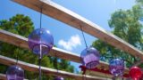 青空の下に飾られた短冊とキャラクターの七夕飾り